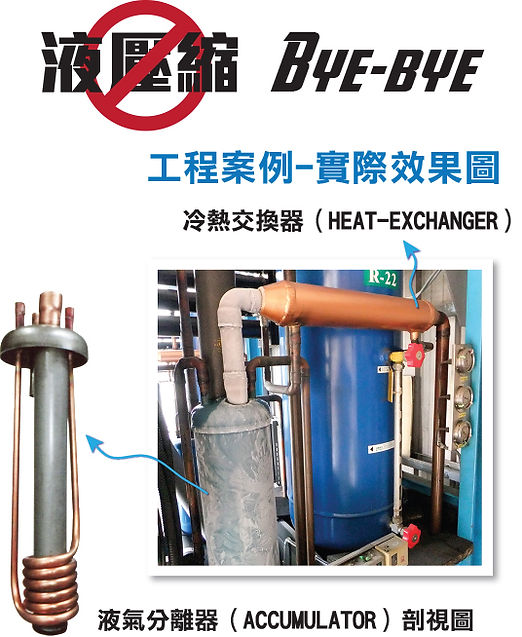 液氣分離器 ( Accumulator ) 與冷熱交換器 ( Heat-Exchanger ) 安裝使用在冷凍系統後段 ( subcooling ),對防止液壓縮產生的效果十分顯著,尤其適用於滿液式系統:如製冰機等設備。